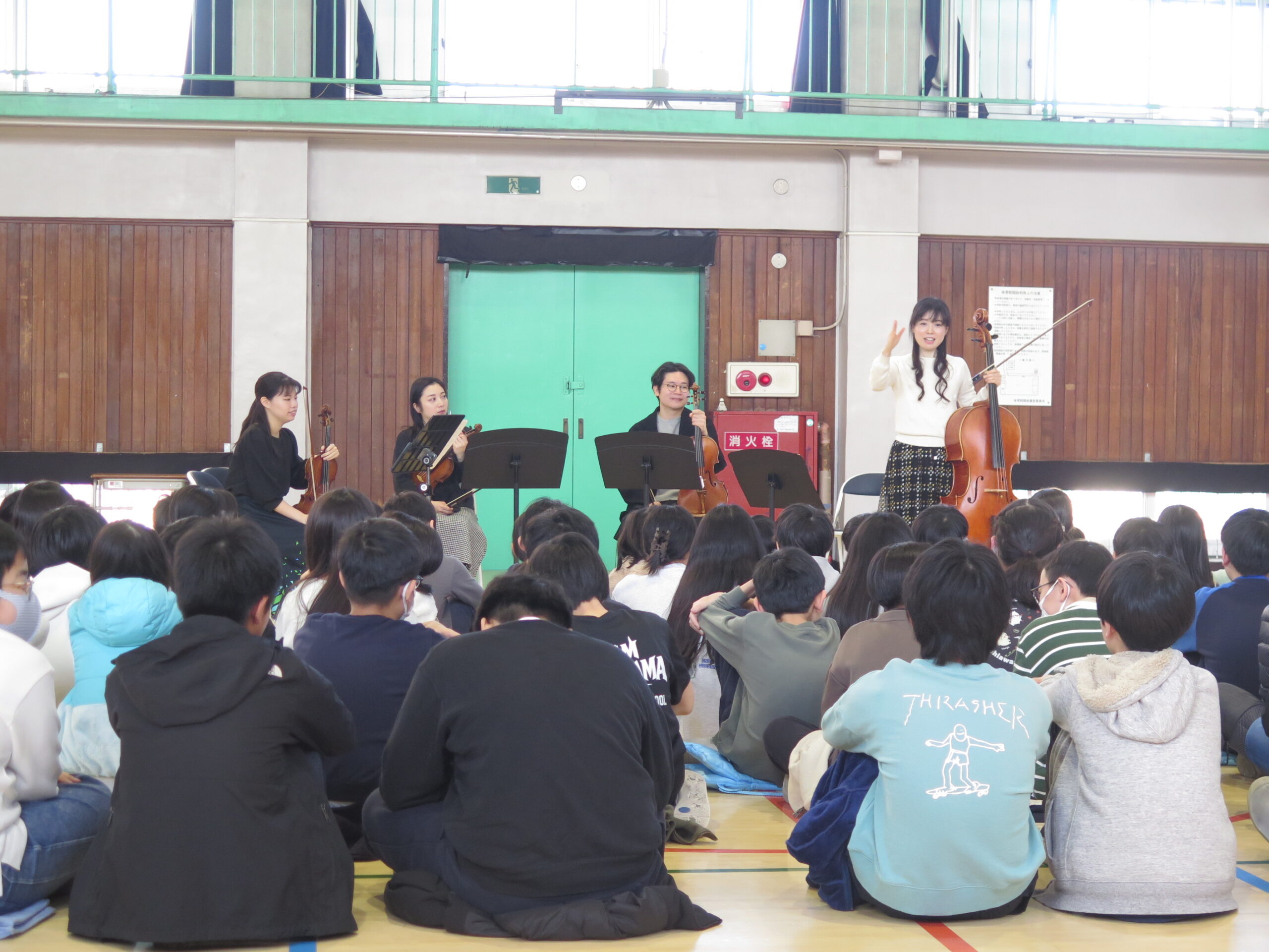 プログラムの締めくくりに弦楽四重奏で大岡山小学校の校歌を演奏。