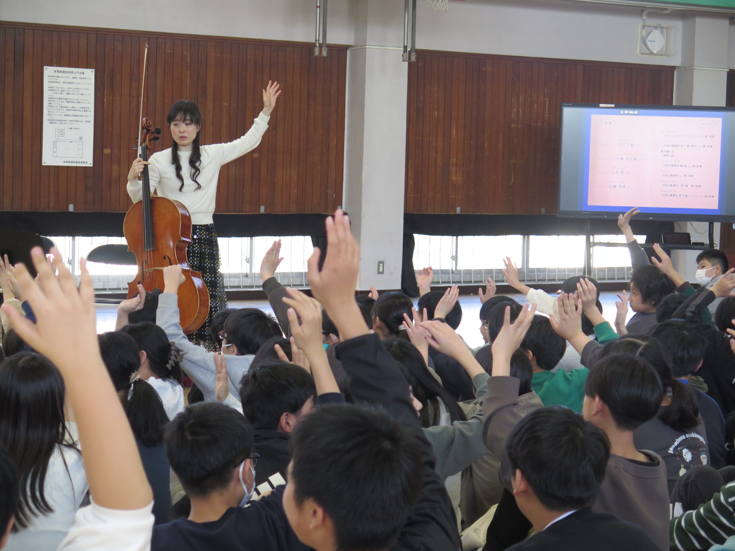 演奏が終わると、チェロの加藤さんから「音楽を楽しむために必要な3つの要素ってなんだと思う?」と問いかけが。